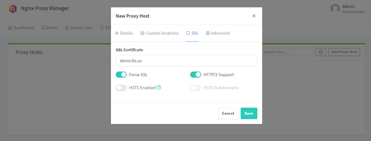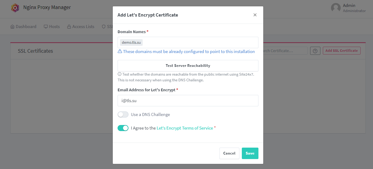 申请完成后回到Hosts > Proxy Hosts