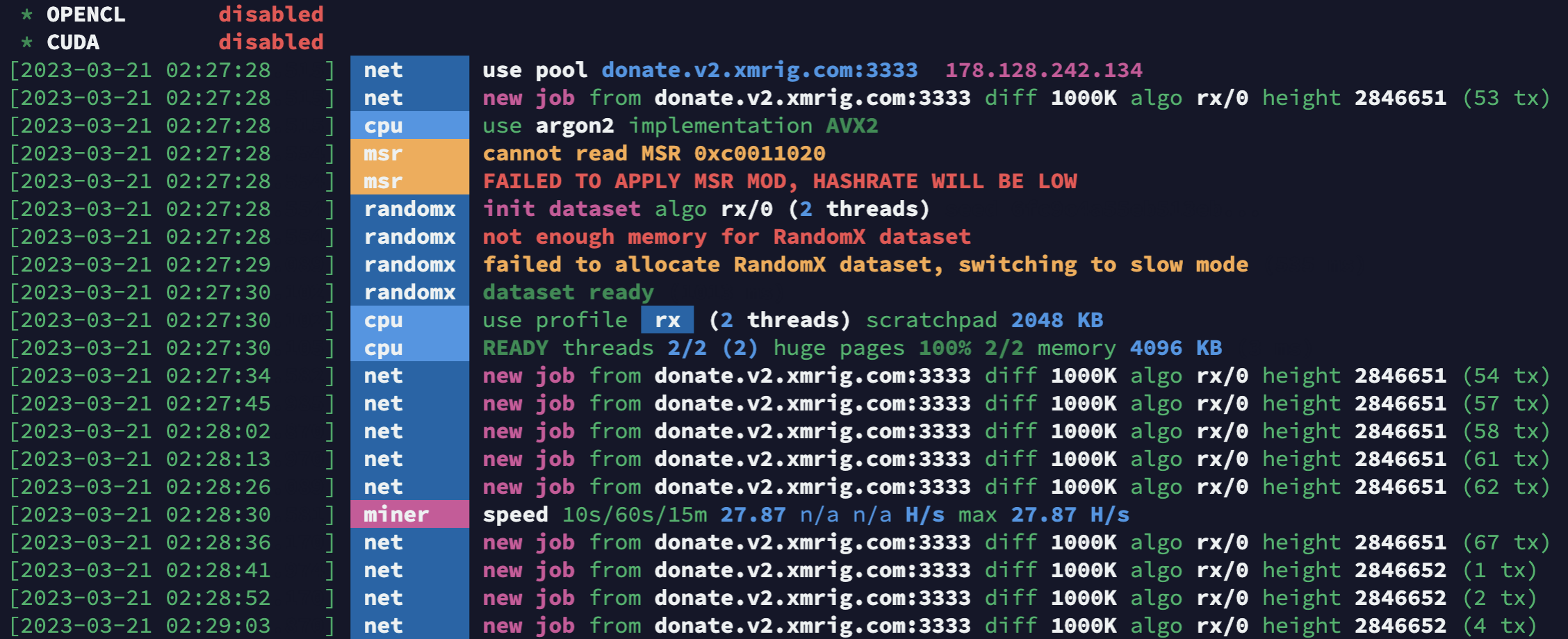 上个命令中,分别是:执行 xmrig,捐赠5%(自己可设置成1%),-u后是钱包地址, -p 后是矿工名字,这个代码可以在 https://xmrig.com/wizard 生成; xmrig这个程序最低抽水是1%,意思是你vps运行的100分钟里,有1分钟是给xmrig打工的; 矿池地址其实可以任选,自己随意,与vps近距离的矿池最好; 运行程序后,下面的输出,说明挖矿已经开始:
